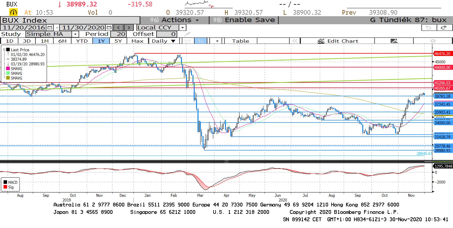 Az erőteljes novemberi emelkedést követően a BUX index is korrekcióval kezdheti az új hónapot. Az MACD már lefordult és rövid időn belül eladási jelzést is adhat, ami trendfordulót jelezhet. A 38.781 pontos szint, ezt követően pedig a 37.343 pontos szintek jelenthetnek támaszt a korrekció során.