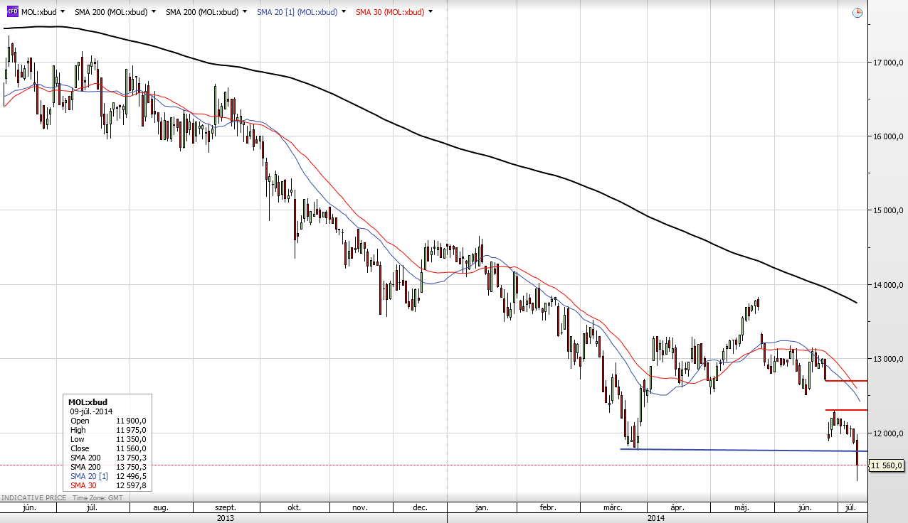 MOL: 5 éve nem látott mélyponton az árfolyam Nem csillapodik az esés a MOL piacán, az árfolyam áttörte a 11.800 forintos támaszát, és nagy eséssel indította a napot. A 11.800 forintos mélypont törésével 5 éve nem látott...