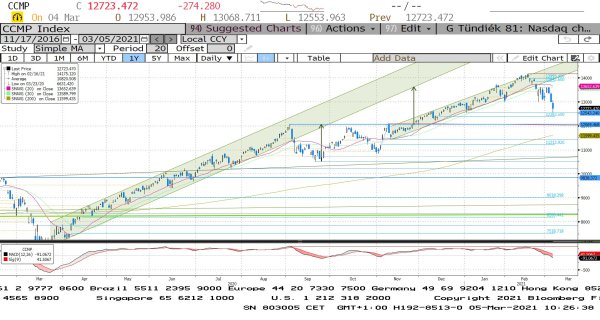 A hozamok emelkedése főleg a technológiai szektor esetében okozott erőteljesebb eladói hullámot. A Nasdaq a február közepi csúcs óta már több mint 10%-ot korrigált. A csökkenés a jövő héten is folytatódhat, támasz a tegnapi mélypont környékén 12.543 pontnál, valamint 12.384 pontnál látható.