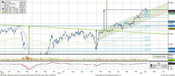 A héten megérkezett az eladási jelzés, legalábbis ami az MACD-t illeti. Ugyanakkor továbbra is a történelmi csúcs közelében vagyunk, és a 20 napos tartja az árfolyamot, de az a gyanúnk, hogy el fog esni, ugyanis az értékeltségi szintek magasak, és az EKB is elkezdett változtatni a hangnemen, ami a mennyiségi lazításokat illeti. A német hozam pedig újra stabilan mínusz 30 bázispont fölött van.