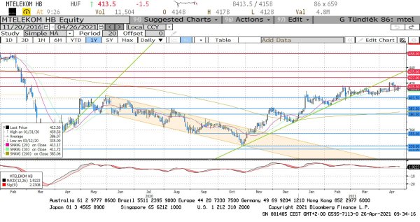 Múlt héten a Magyar Telekom árfolyama visszaesett a 415,5 forintos szint alá. Az elmúlt napokban a rövidtávú mozgóátlagok körül alakult az árfolyam. A mozgóátlagok emelkedése támogatja, hogy a részvény ismét megpróbálkozzon a 415,5 forintos ellenállás áttörésével. Támaszt a rövidtávú mozgóátlagok jelentenek 411 és 413 forint között.