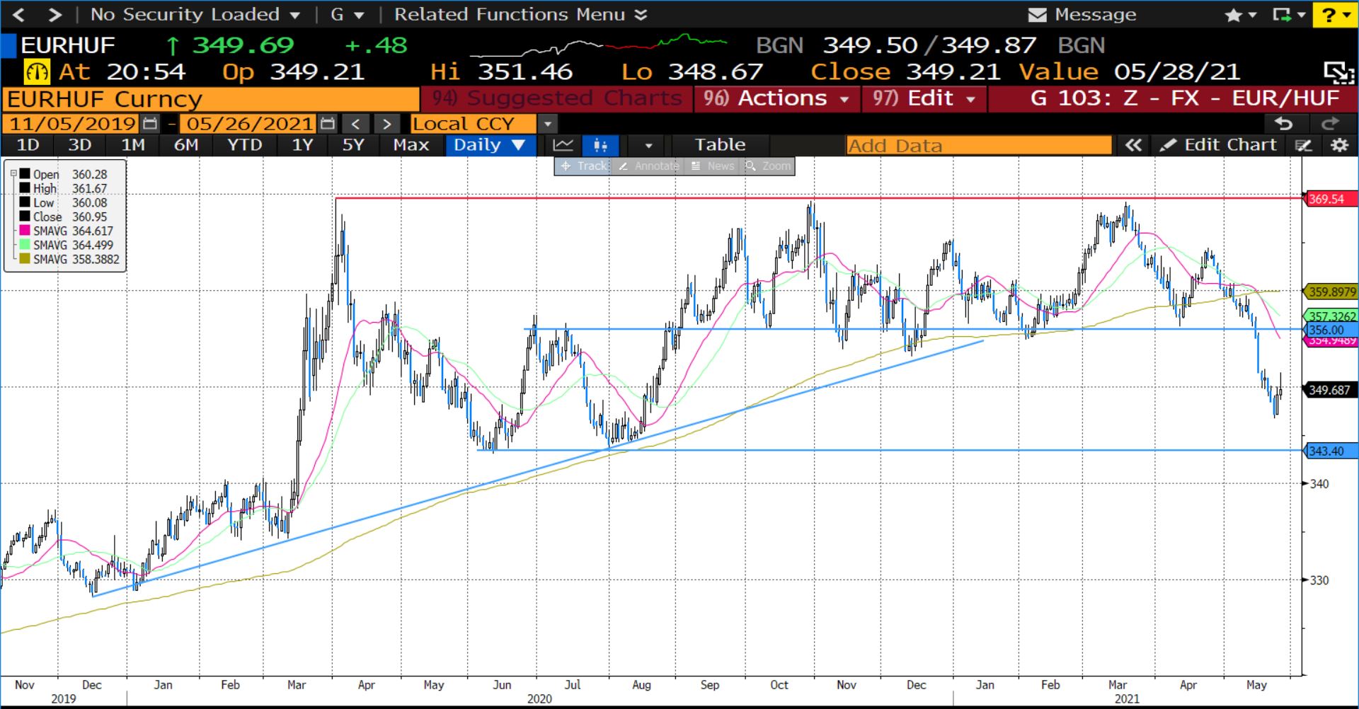 A múlt heti jelentős korrekciót követően nem meglepő, hogy konszolidálni kezdett az árfolyam. Ha azonban sikerül ledolgozni a reálkamat különbözetet, akkor a forint tovább erősödhet 343 irányába.