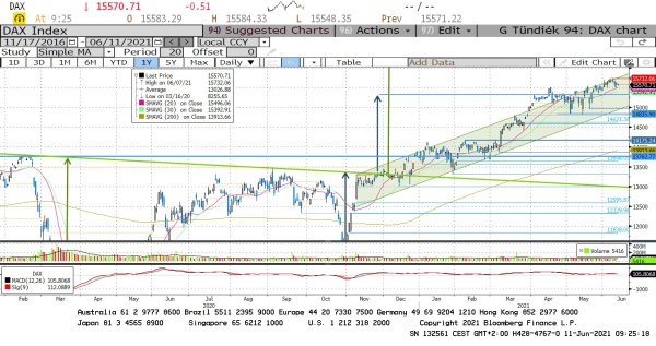 Apró pici csökkenésekkel, de elkezdett az emelkedő trendcsatorna felső éléről lefordulni a DAX index. Támaszt a 20 és a 30 napos mozgóátlag jelenthet 15.496 ás 15.392 pontnál. A rövidtávú technikai kép inkább az oldalazás irányába mutat, de a pozitív hosszútávú kép továbbra is életben van.
