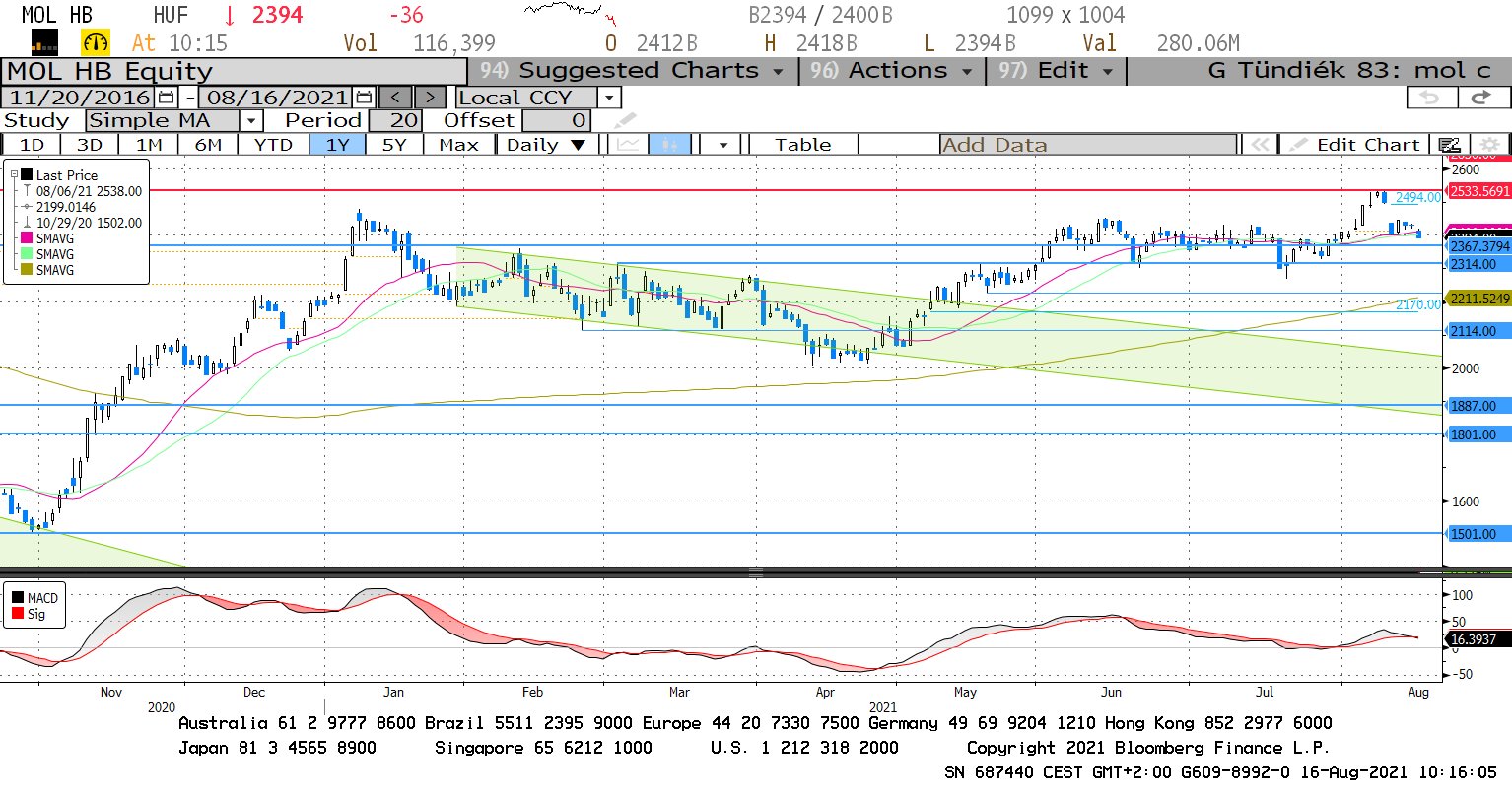 A ma reggeli csökkenéssel elestek a rövidtávú mozgóátlagok a MOL-nál. A következő támasz 2.367 forintnál...