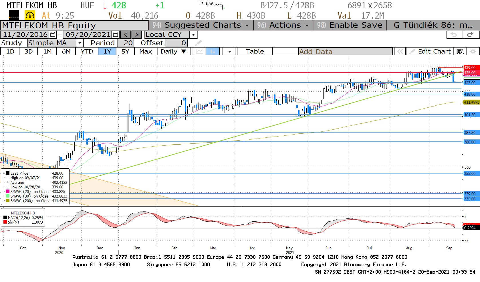 Pénteken váratlanul nagyot esett a Magyar Telekom árfolyama, ami ezzel a 427-es támaszig csökkent. A szint megtarthatja az árfolyamot, így a jelenlegi szintről inkább oldalazás, enyhe emelkedés várható. Ha azonban mégis elesne a szint, akkor a 422-es lokális mélypont jelenthet támaszt.