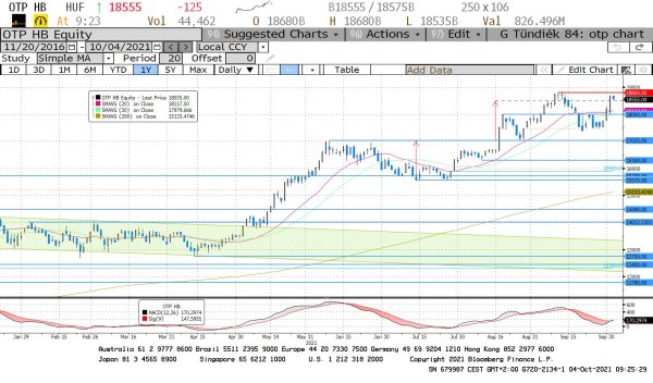 Csütörtökön és pénteken jelentős emelkedés volt látható az OTP árfolyamában, melynek eredményeként a részvény a korábbi történelmi csúcs, 18.800 forint közelébe emelkedett, miközben az MACD is vételi jelzést adott. Bár a nemzetközi hangulat nem a legkedvezőbb, a technikai kép alapján mégis elképzelhető, hogy új csúcsra emelkedjen a részvény.