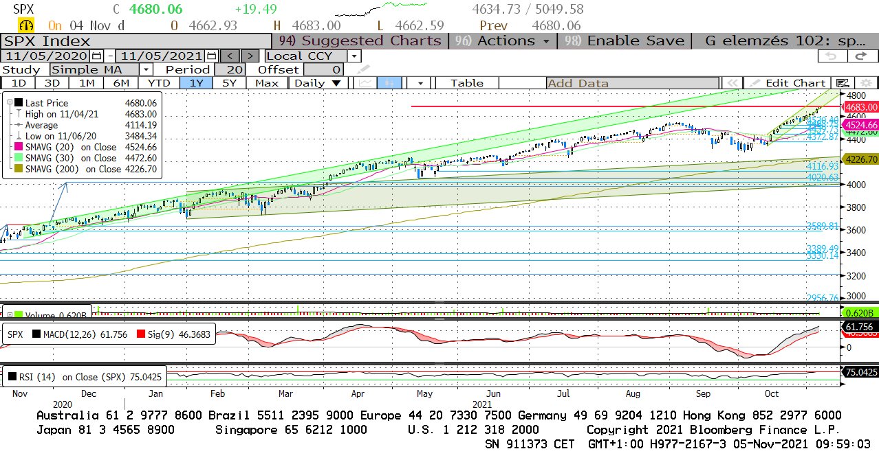 A technikai kép egy óvatosabb, oldalazós mozgást jelez, azok után, hogy az árfolyam az elmúlt pár hétben új csúcsot döntött. Az RSI mutató 75 pontos értéke túlvettséget mutat, de az MACD még mindig nagy iramban emelkedik. Az árfolyam jelenleg egy emelkedő trendcsatorna alján mozog, és ha lefordul, akkor megkezdődhet egy korrekciós folyamat. Az első támasz a 4.524 pontnál, a 20 napos mozgóátlagnál várható, majd ezt követőn pár ponttal alatta, 4.520-nál egy rés is megállíthatja az esést.