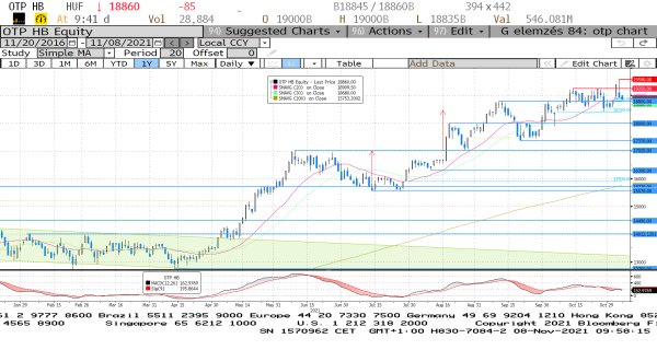 Hiába közelítette meg a történelmi rekordot az OTP harmadik negyedéves profitja, az óvatosság által vezérelt, vártnál magasabb céltartalékképzés miatt elmaradt a várakozásoktól a negyedéves jelentés. A vártnál némileg halványabb eredmény és az októberi jelentős árfolyamemelkedés együtt az árfolyam lefordulását eredményezte, bár előtte pénteken még történelmi csúcsra ugrott a kurzus. A lefordulás miatt korrekciós periódus következhet. Támaszt a 18.785 forintnál hagyott rés, valamint a 30 napos mozgóátlag jelenthet 18.680 forintnál.