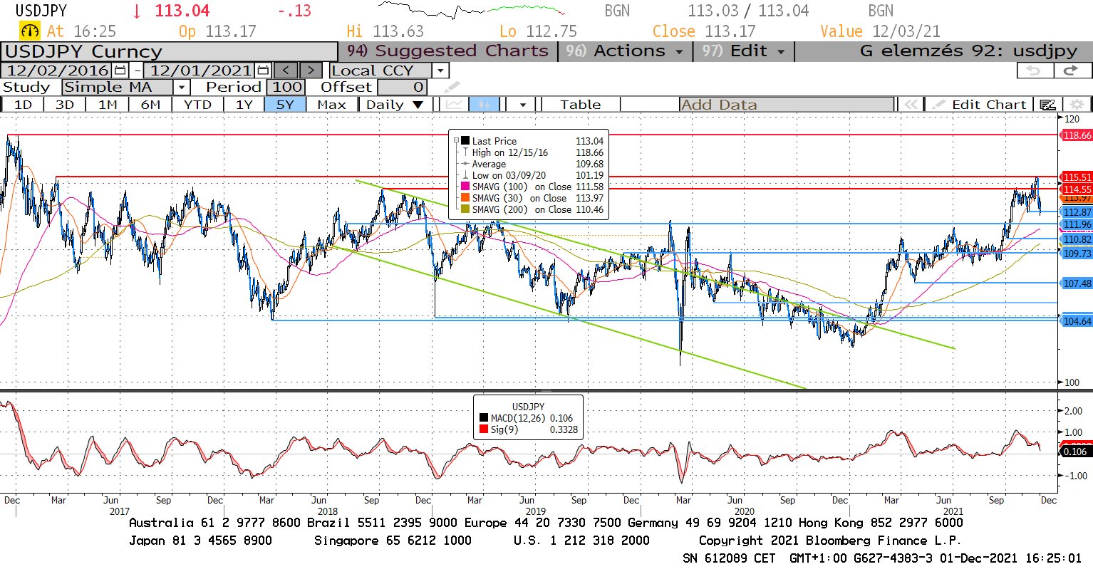 A klasszikusan menekülő devizaként számontartott japán jennek segített erősödni az új koronavírus variáns okozta piaci hangulat. A japán deviza 2,2%-ot erősödött egy hét alatt, az MACD élesen letört, dollár eladást jelez.
