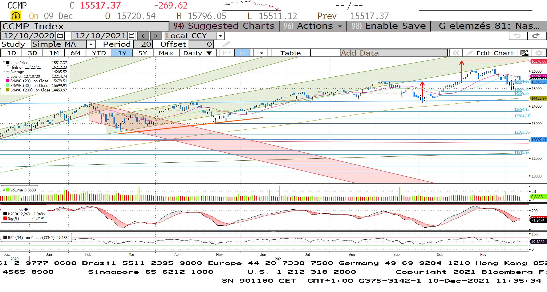 Közel 2%-kal emelkedett az index a héten, és az inflációs adatot követően ez jövőhéten is folytatódhat, ugyan valószínűleg kisebb lendülettel. Pár nap emelkedést követően az MACD és a mozgóátlagok is egy vételi jelzést adhatnak, ami tovább emelheti az árfolyamot. Támaszként a 15.375 pont szolgálhat, míg az emelkedést pedig a 15.679 pontnál található 20-napos mozgóátlag nehezítheti meg.