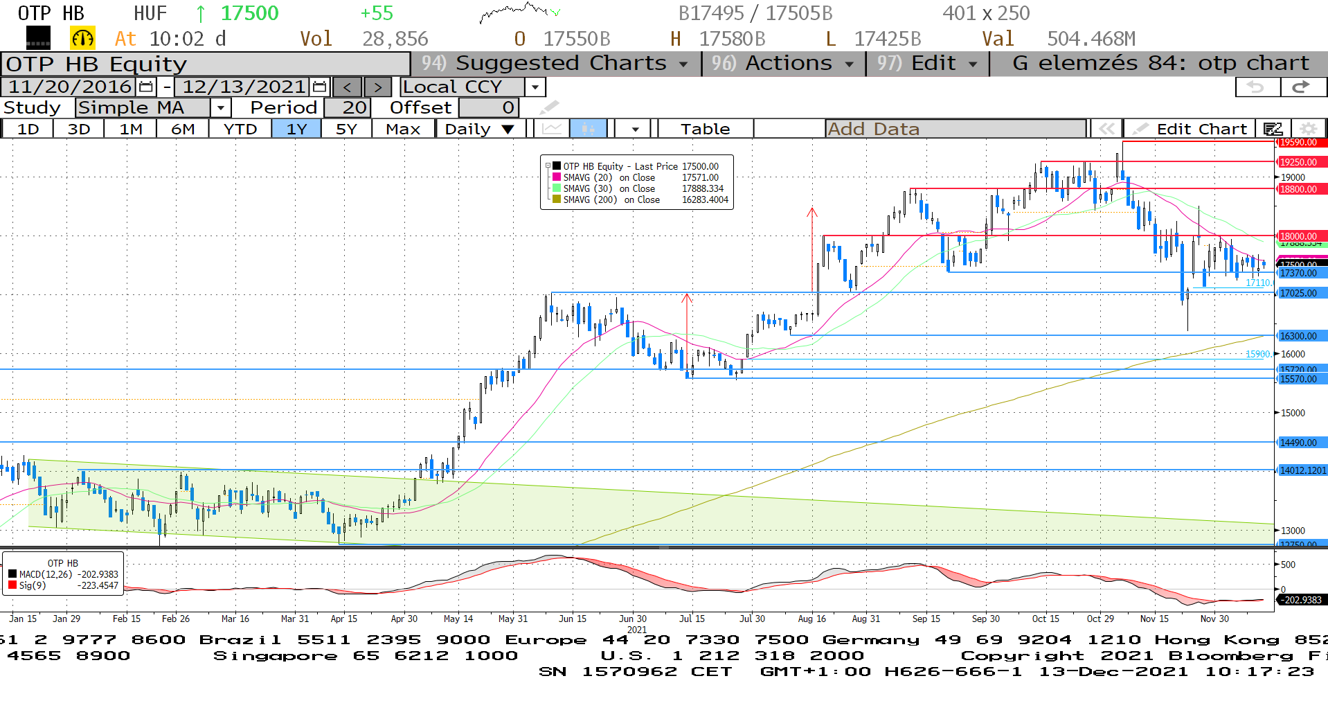 Az elmúlt napokban a 20 napos mozgóátlag alatt oldalazott az OTP árfolyama. Az MACD és az RSI indikátor is teljesen kisimult, így egyelőre nem várható jelentősebb elmozdulás, maradhat az oldalazó mozgás. Ellenállást a rövidtávú mozgóátlagok jelentenek, míg támasz 17.370 forintnál van.