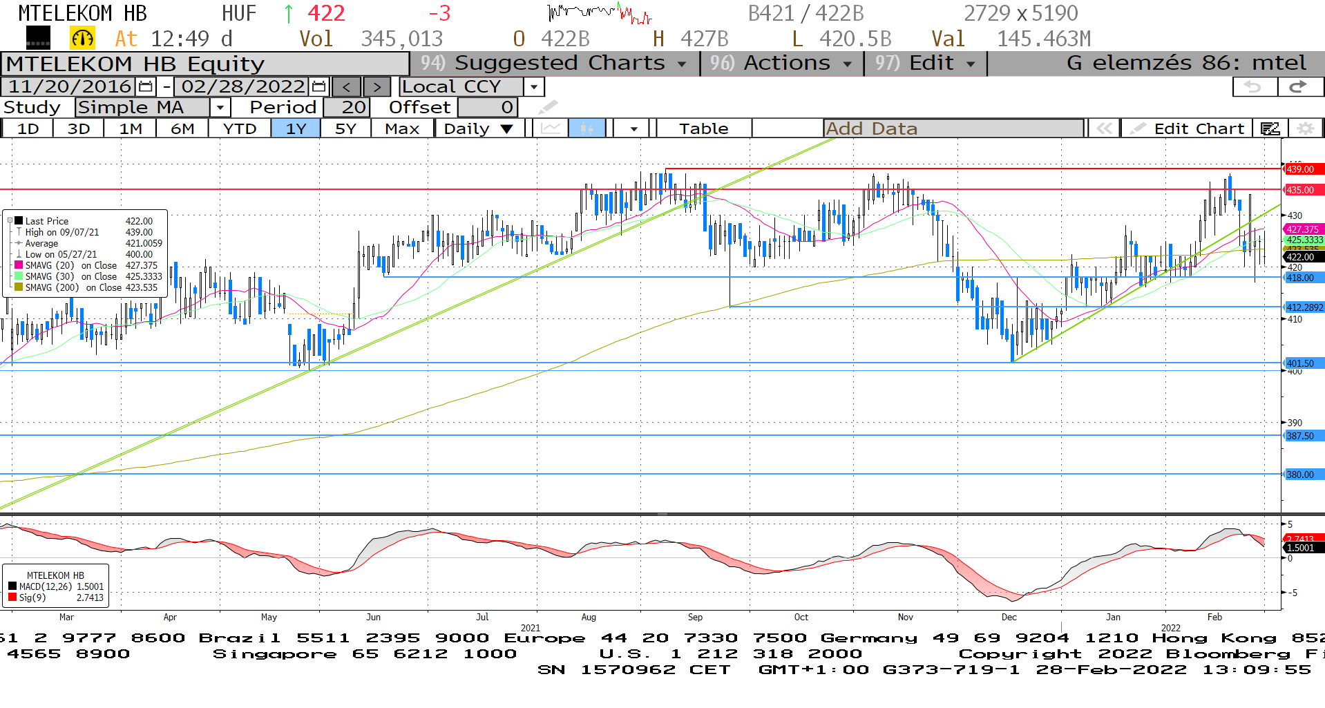 A Magyar Telekom árfolyama jól tartja magát, menedéknek számít a hazai piacon belül. Az árfolyam az elmúlt napokban a 200 napos mozgóátlag körül oldalazott és ez a mozgás folytatódhat a következő napokban is. Támasz 418 forintnál, ellenállás 423,5 forintnál található.