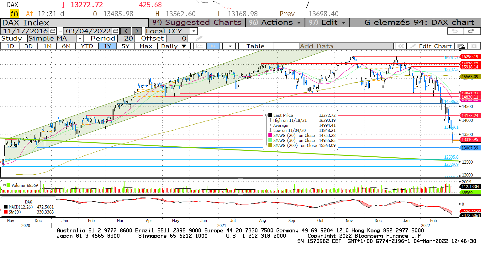 Az európai részvénypiacok sokkal jobban megszenvedik az orosz-ukrán háborút, mint amerikai társaik. A DAX esetében is erős lejtmenet látható, mely során több alkalommal is réssel esik az index. A következő támasz 13.000 pont környékén látható, míg ellenállást a ma reggel hagyott rés felső éle jelent 13.669 pontnál. A DAX index egyéves mélypontra esett mostanra.