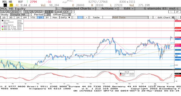 A részvényenkénti 300 forintos osztalékjavaslatra kiugró árfolyamemelkedéssel reagált a MOL. Az árfolyam a novemberi 2.800 forintos csúcsig emelkedett, majd a szint közelében oldalazásba kezdett. A következő néhány napban enyhe csökkenés elképzelhető, de ezzel együtt összességében inkább oldalazó mozgás várható. Támasz 2.768 és 2.668 forintnál látható. Ha sikerülne a novemberi lokális csúcsot áttörnie az árfolyamnak, akkor 2020 óta nem látott magasságba emelkedhetne a részvény.