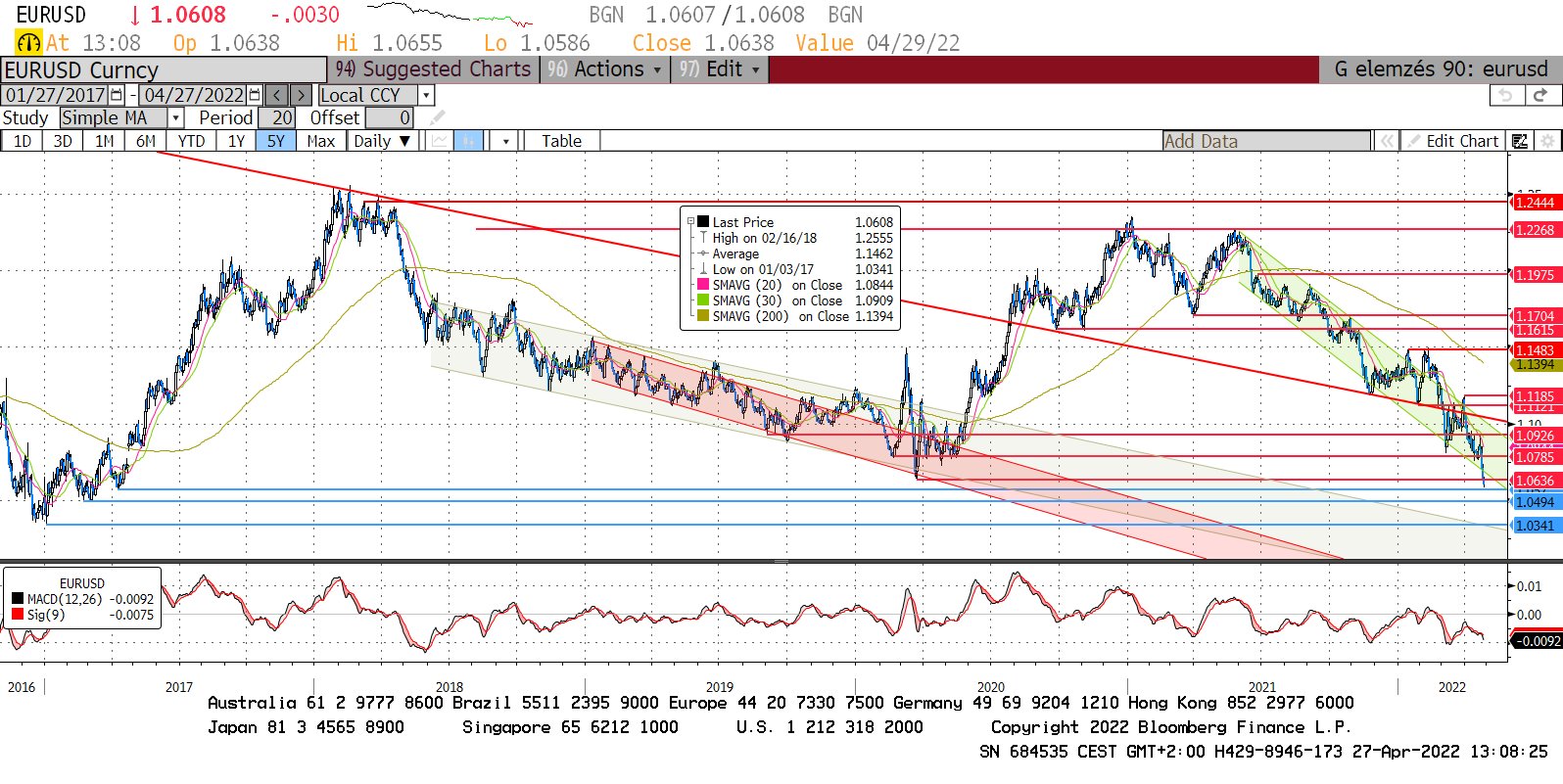 Amíg a Fed relatíve jól követhetően és kiszámíthatóan kommunikálja a közeljövőre vonatkozó kamatemelési terveit, addig az EKB leginkább csak kétségeket okoz – de azt legalább konzisztensen. A befektetők nem szeretik a bizonytalanságot, így az utóbbi napokban nagy sebességgel váltották dollárra az euróban tartott eszközeiket, ami 5 éve nem látott alacsony szintre küldte a kurzust. Jelenleg az a kérdés, hogy a 2017. márciusi támasz képes lesz e megállítani a zuhanást. Holnap jelenik meg az amerikai, pénteken pedig az eurózónás inflációs adat, míg a jövő héten kamatdöntő ülést tart a Fed.