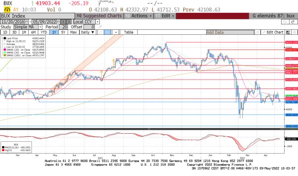 Negatív a nemzetközi hangulat, és a gyorsjelentési szezon sem úgy indult itthon, mint szerettük volna. Így inkább az eladók dominálhatnak a tőzsdén. Jelenleg éppen a 41.759 pontos támasz fölött tartózkodik a BUX árfolyama. Ennek eltörése esetén az áprilisi lokális mélypontig, 41.018 pontig csökkenhet az index.