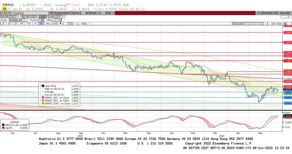 Tartotta 1,07 körüli szintjét az EURUSD. A pénzpiacok megnyugodtak, és kivárják a Fed illetve az EKB lépését. Előbbi jövő héten várható, 50 bázispontos változtatással, míg utóbbi holnap, ahol inkább a várható szigorítások mértékének és ütemének hangsúlyozása lehet mérvadó.