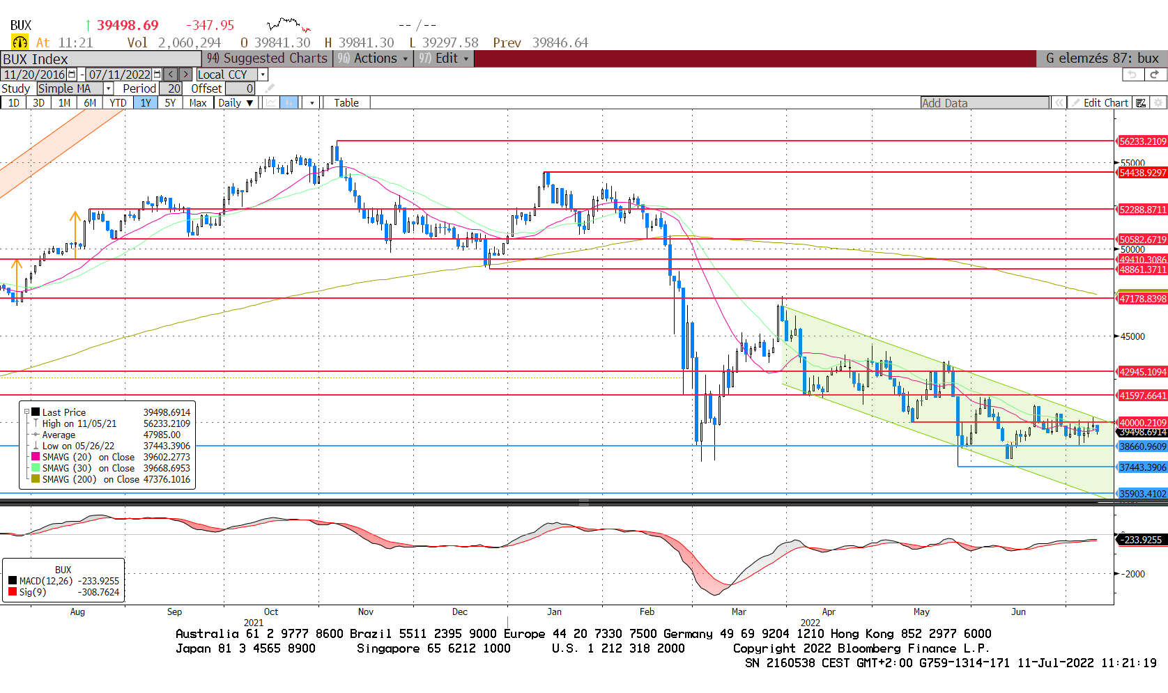 A BUX index oldalazó mozgással közelíti a csökkenő trendcsatorna felső élét. A következő pár napban azonban még nem kell a lefordulástól tartanunk, maradhat továbbra is az oldalazás. Ellenállást a lélektani 40.000 pont jelent, míg támaszt a rövidtávú mozgóátlagok képviselnek.