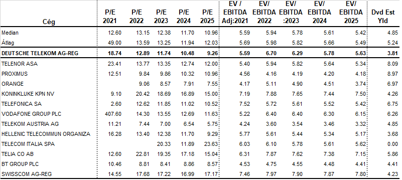 A vállalat összehasonlító értékeléséhez először is egy hasonló jellemzőkkel bíró cégekből felállított csoportra van szükség. Jelen esetben egy Bloomberg által összeállított 13 tagból álló úgynevezett peer groupot használunk. A következő bekezdésekben a Deutsche Telekomot 3 különböző mutató alapján hasonlítjuk a hasonló cégek csoportjának átlag értékéhez. A csoport átlaga helyett a medián érték is használható, mikor kiugró, szokatlan értékek találhatóak egyes cégek adataiban. Az ilyen esetekben medián alkalmazása jobban jellemezi az adatokat, mivel a kiugró értékek nem torzítják azt.