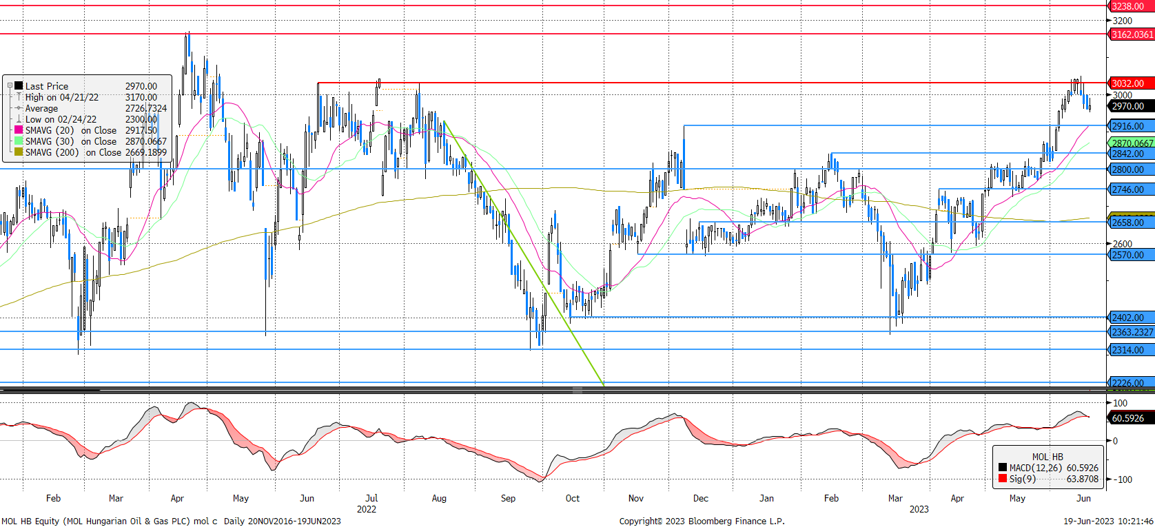 A 3.032 forint könyéki szintről lefordult a MOL árfolyama. Jelenleg egy korrekciós periódus tapasztalható, melyben támaszt majd a 2.916...