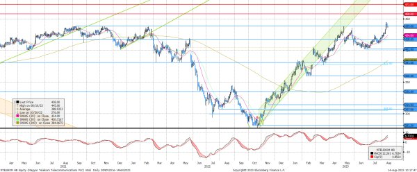 Bár a Magyar Telekom áttörte a 439 forintos szintet, nem sikerült a szint fölött megkapaszkodnia, mostanra visszaesett a szint alá. A következő napok sorsdöntőek lesznek. Ha az árfolyam inkább oldalazni fog, akkor akár egy fülescsésze alakzat is kirajzolódhat, néhány hetes távon komoly felértékelődési potenciált kínálva, de a jelenlegi grafikonban akár a 20 napos mozgóátlag visszatesztelése is benne lehet, ami viszont semmissé tenné a technikai formációt.