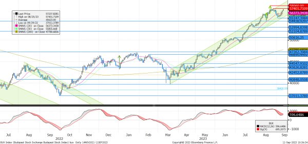 Napokon belül új történelmi csúcsra ugorhat a BUX index. A technikai kép az index és az egyedi részvények szintjén is kedvező. A korábbi történelmi csúcs (57.402 pont) egyelőre ellenállást jelent, de a technikai kép alapján már nem sokáig. Mivel jelenleg a Richter a vezető papír a magyar részvénypiacon, így elsősorban ennek mozgását lesz érdemes figyelni, ez lehet iránymutató az indexre nézve is.