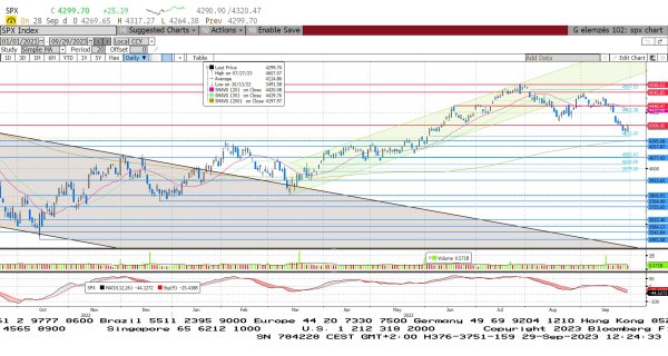 Az elmúlt négy napból háromszor pozitívban zárt az S&P 500, de a keddi nagyobb mértékű esés negatívba rántotta az e heti teljesítményt. Az RSI már a túladottság határát súrolta, amikor sikerült felpattannia. A technikai kép fordulatra utal, bár az MACD egyelőre nem adott vételi jelzést. A csökkenő inflációt jelző adatok ellenére az amerikai kormányzat esetleges leállása továbbra is kockázatot jelent a részvénypiacokon, ami óvatosságra int.