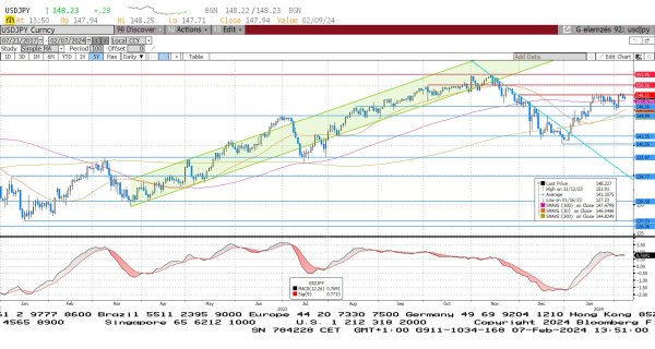 Megpróbált erősíteni a japán jen, végül azonban nem sikerült tartósan letörnie a 146,6-nál húzódó támaszt. Az árfolyam ismét 148 felett jár a dollárral szemben, amit stabilan képes megtartani a 148,5-ös ellenállás.
