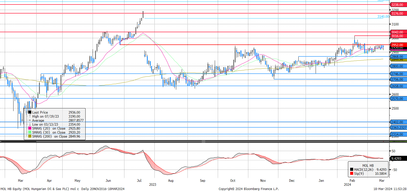 Múlt héten mutatta be a MOL a 2030-ig szóló frissített stratégiáját. Éles irányváltások helyett az eddigi stratégia meghosszabbítása látható. Vagyis alapvetően minden megy tovább az eddigi kerékvágásban, így az árfolyam sem reagált rá. A részvény jelenleg oldalaz. Ellenállás 2.952 forintnál látható, míg támaszt a rövidtávú mozgóátlagok jelentenek 2.926 és 2.920 forintnál.