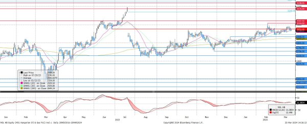 Átjáróházzá vált a 2.952 forintnál levő szint, azaz valójában megszűnt a szerepe. (Azért a grafikonban egyelőre még benne hagytuk.) Az MACD a pozitív tartományban oldalazik, vagy talán inkább korrigálós jeleket mutat, de a részvényárfolyam is inkább oldalazik, ami maradhat még egy darabig. Minezt annak ellenére, vagy éppen azért, mert 250 forint az igazgatóság osztalékjavaslata.