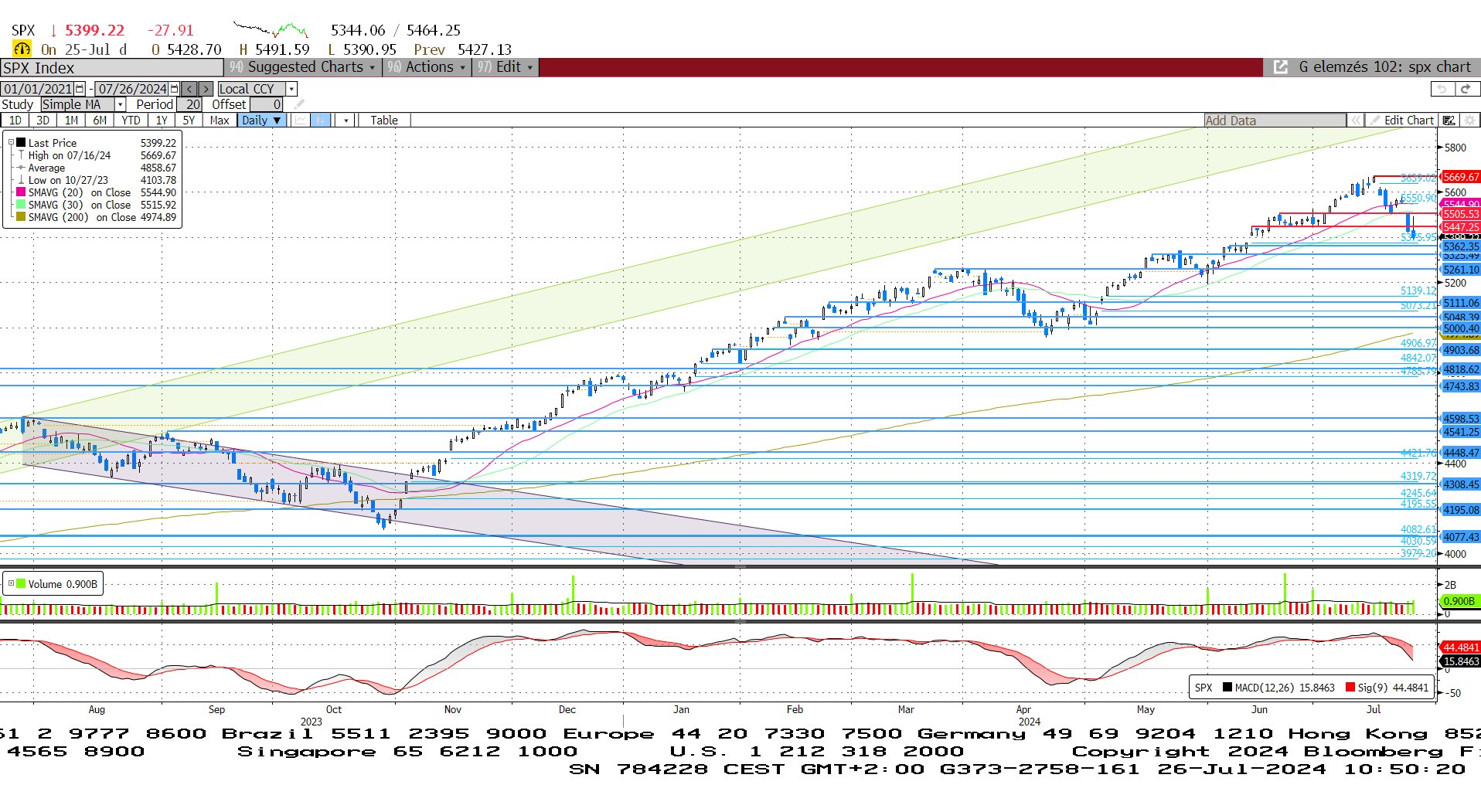 Emelkedéssel kezdte a hetet az S&P 500, de ez nem bizonyult tartósnak, és szerdán meredek zuhanásba kezdett. Csütörtökön sem sikerült fordulni, így majdnem az 5.376 pontnál hagyott rés alsó éle, illetve az 5.362 pontos szint jelentette támasz közelébe ereszkedett. A korrekció nagyobb része valószínűleg lezajlott, a folytatásban a jövő héten érkező gyorsjelentések mozgathatják az indexet.