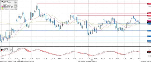 A héten mindkét napon szilárdnak bizonyult az 1,081-es támasz. A mostani elrugaszkodás betudható az összességében pozitív lecsengésű európai gazdasági adatok hatásának, illetve a Fed-től várható tartás döntés mellett fontos lesz a kommentár is. Ez eldöntheti az MACD alapján még kitartható esés és a támasz közötti küzdelmet. Ha nem lesz valamiféle erős állítás, vagy a kommentár csökkenti a kamatcsökkentési kilátásokat, akár el is eshet a támasz szint, azaz erősödhet a dollár. Viszont összeségében nem várunk erős, piacmozgató kijelentést. Szóval talán az oldalazás győz.
