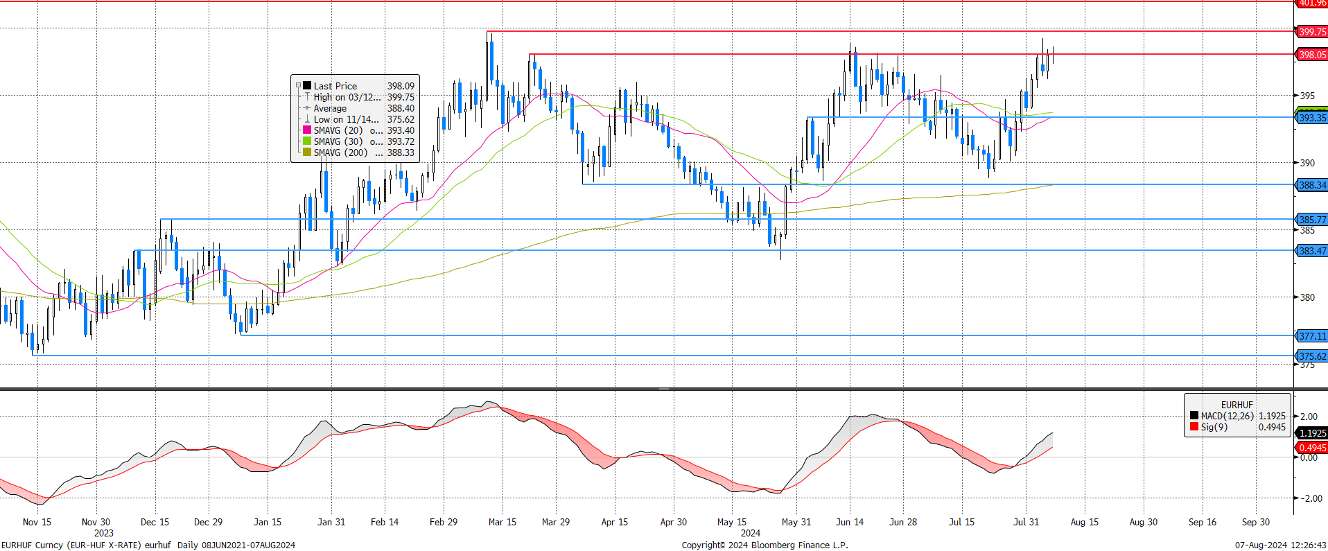 Az elmúlt öt hónapban harmadik alkalommal csúcsosodik 398 forintnál az euró ereje. Az elmúlt egy hétben kialakult pánikhangulat lecsengése alapvetően segíthetne a forint konszolidációjában, viszont a 20 és 30 napos mozgóátlag is az első támasznál, 393,4 forintnál helyezkedik el. Mindenesetre az MACD indikátor vételt jelez, ami további megpróbáltatásoknak vetheti alá a forintot és az ellenállásait.