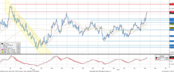 Az árfolyam jelenleg a tavaly év végi 1,114-es árfolyamot támadja, amelyet az MACD vételi jelzése alapján képes is lehet áttörni. A mozgóátlagok egyelőre nem tudták lekövetni a hirtelen megugrást, azonban természetesen 20 és 30 napos is erős felívelő pályán követi az árfolyamot.