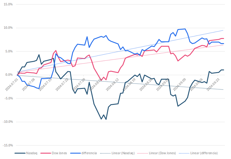 Nagyjából szeptember 9-én érte el a csúcsát, és mostanra 6,7 százalékra csökkent a június vége óta számított különbözet a Dow Jones és a Nasdaq index között. Vagyis, ha az előbbit érték alapú indexnek, míg a másikat növekedésinek tekintjük, akkor a kettő közötti különbözet ennyit csúszott vissza az elmúlt időszak részvénypiaci fellendülésében. Az ilyen időszak pedig általában a növekedési részvényeket részesíti előnyben.