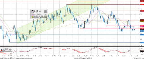 Hiába döntött az agresszívabb vágás mellett a Fed, a forint nem igazán tudott erőt venni magán és nem történt áttörés. Magyar oldalról a hét további részében nem várható jelentős gazdasági esemény, ami változást hozhatna. A kiegyenesedett MACD is azt jelzi előre, hogy nincs egyértelmű célirány a jelenlegi helyzetben és némi erőegyensúly állt be a jegyzésben.