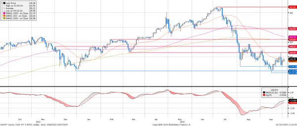 A múlt pénteki pártelnökségi választást meglepetésre megnyerő Sigeru Isiba, akit ma miniszterelnökké is kineveztek, csupán egy napra tudta megállítani a jen gyengülését. Ezzel szemben a héten már inkább a 30 napos mozgóátlag körül forgott a jegyzés, ahonnan pedig ismét elrugaszkodni látszik. Az MACD hetekkel ezelőtt adott vételi jelzése továbbra is releváns, ráadásul egyre közelebb a pozitív tartományhoz, ami egy újabb löketet adhatna az első ellenállás eléréséhez.