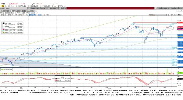 A geopolitikai feszültségek mellett az sem kedvezett a Nasdaq-nak, hogy Jerome Powell a piaci várakozásoknál lassabb ütemű kamatcsökkentést jelzett előre a következő hónapokra. A júliusban hagyott rés betöltése előtt lefordult az index, és az MACD indikátor is közel áll ahhoz, hogy eladási jelzést adjon. A pozitív meglepetést okozó munkaerőpiaci adatok azonban segíthetik az indexet. Támaszt a 20 és 30 napos mozgóátlag jelenthet.