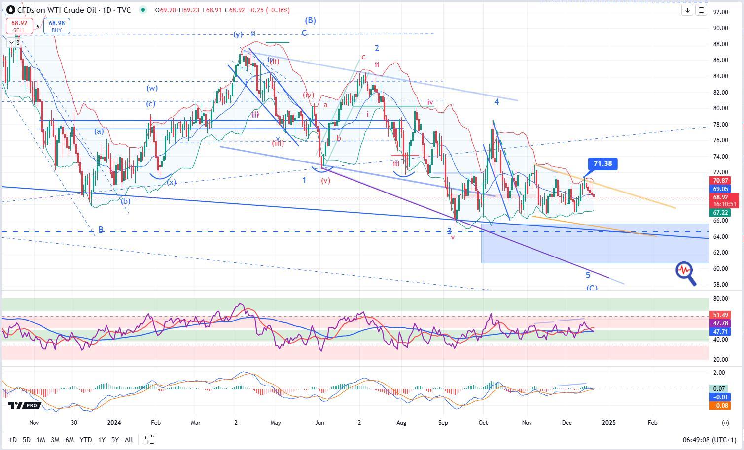 A vélelmezett alacsonyabb tető (71,38) után fordulós jelzés született, kialakult két short indikátor-konfiguráció, mely gyenge indikátorérték-környezetben és egy sávban alakult ki, így a formációkra jellemző (58-65%-os) beválási valószínűségnél jelen esetben jóval gyengébb lehet. Az egyik belépő célár 66,80, a másik elsődleges célárát már elérte a piac, a másodlagos 67,10-nél található, a harmadlagos 64,50-nél.