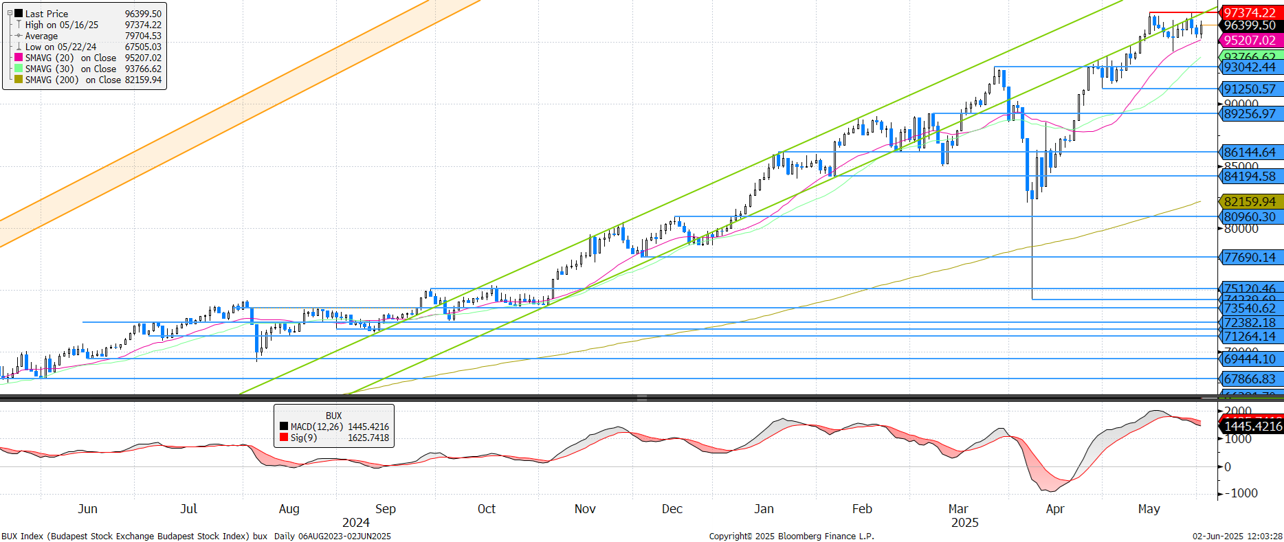Múlt héten ismét felszúrt a történelmi csúcsra a BUX index, de az új csúcshoz nem volt benne elég erő. Az MACD indikátor alapján korrekciós fázisban van an index, így az oldalazó mozgás is jó teljesítménynek tekinthető. Támaszt a 20 napos mozgóátlag jelent 95.207 pontnál, míg ellenállást a történelmi csúcs jelent 97.374 pontnál.