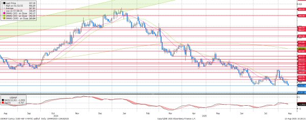 A keddi amerikai inflációs adatra gyengült a dollár, ami a forinttal szemben is meglátszódott. Ezzel megérkezett a 336,9-es támaszszintre, amit másfél hónapon belül már harmadjára tesztel az árfolyam. Ha sikerül az áttörés, az további erősödésnek engedhet teret a forint számára, tekintettel az amerikai kamatvágási ciklus várható szeptemberi megkezdésére.