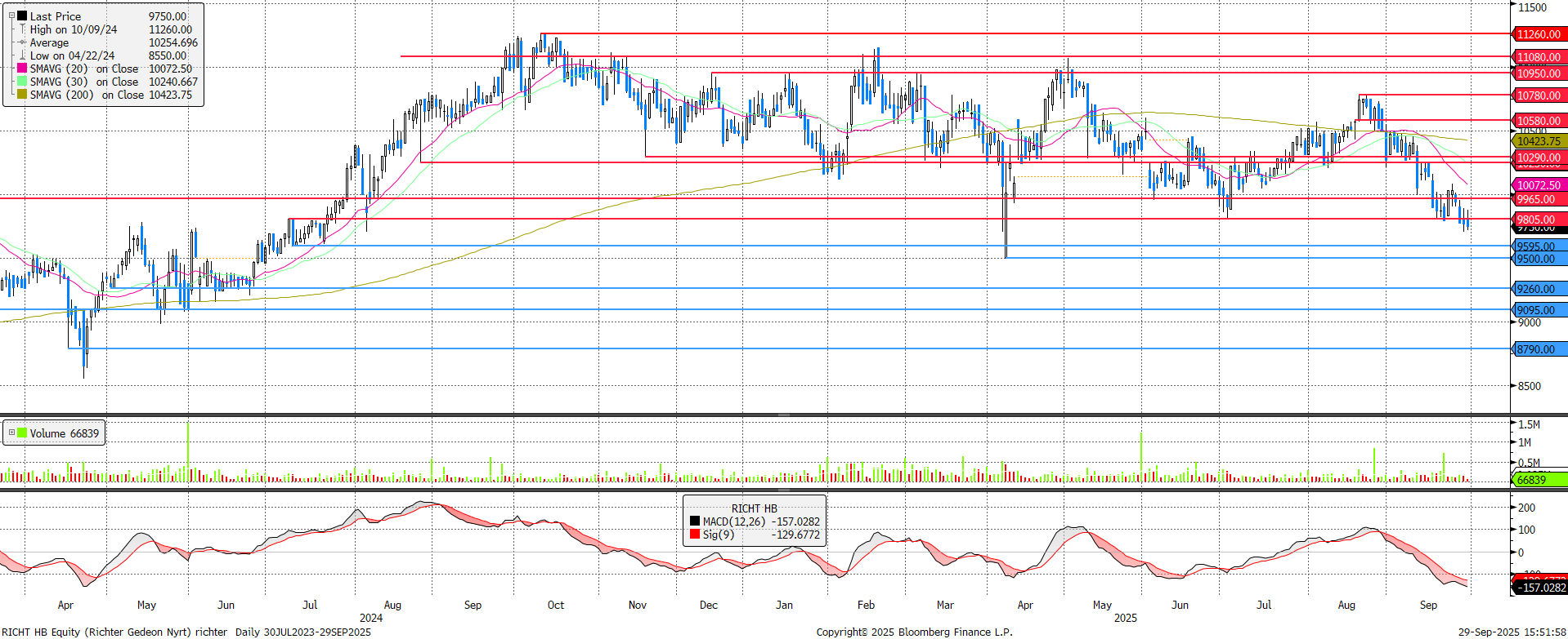 Egyelőre nem akar fordulni a Richter árfolyama, annak ellenére sem, hogy Trump vámjai nem igazán érintik, a denosumab pedig szabad utat kapott az USA-ban. Szóval lenne okunk örülni, hiszen a RUBHUF árfolyam is kapaszkodni kezdett az elmúlt egy hét során, s az EURHUF is hasonló pályát fut be. Szóval illene valamiféle fordulatot felmutatni, amit az erősen túladottnak tűnő MACD is indokolhat. Egyelőre azonban nem igazán látunk ilyen jellegű mozgást. Viszont jó esély van arra, hogy valamiféle oldalazás kialakuljon.