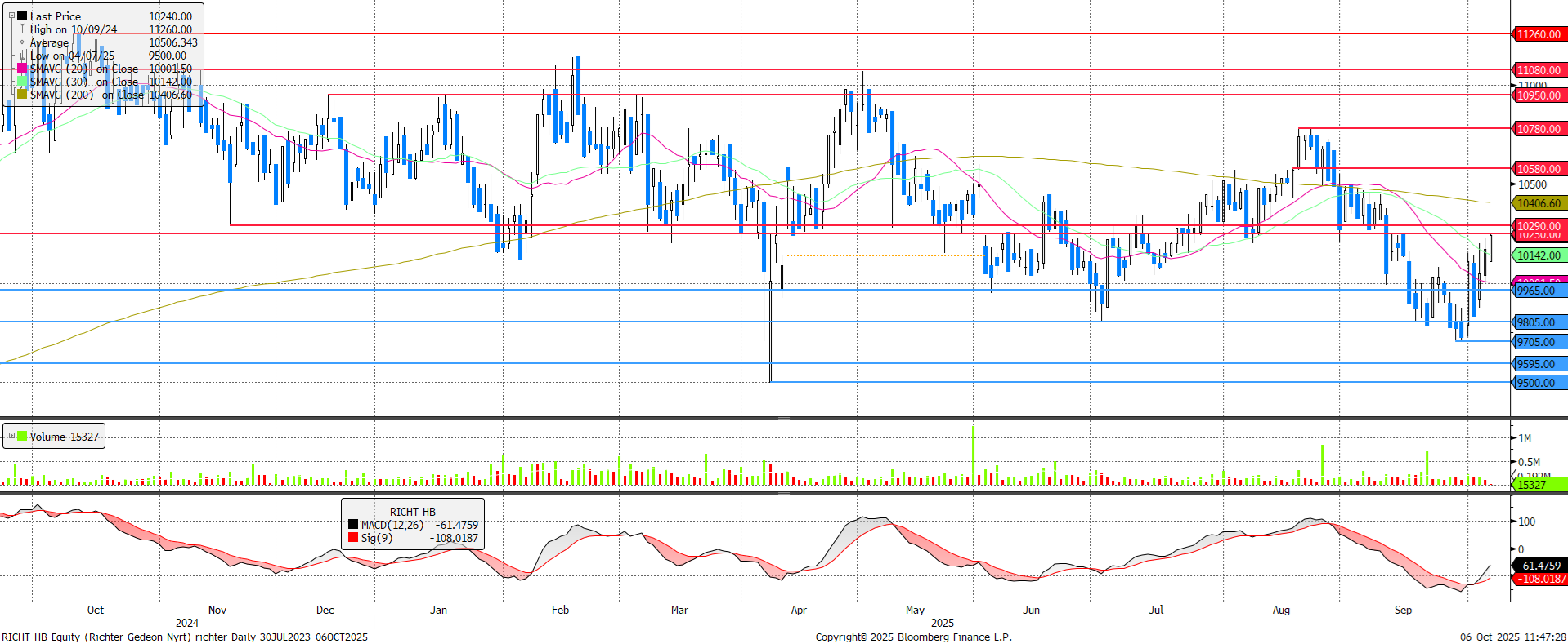 A Richter árfolyama az amerikai egészségügyi szektorral együtt pattant fel, miután a Pfizer megállapodott az amerikai adminisztrációval a vámok kapcsán. A gyors emelkedés során a 10.250-10.290 közti ellenállás zónához érkezett az árfolyam, melynek áttörése szükséges az emelkedés folytatása érdekében.