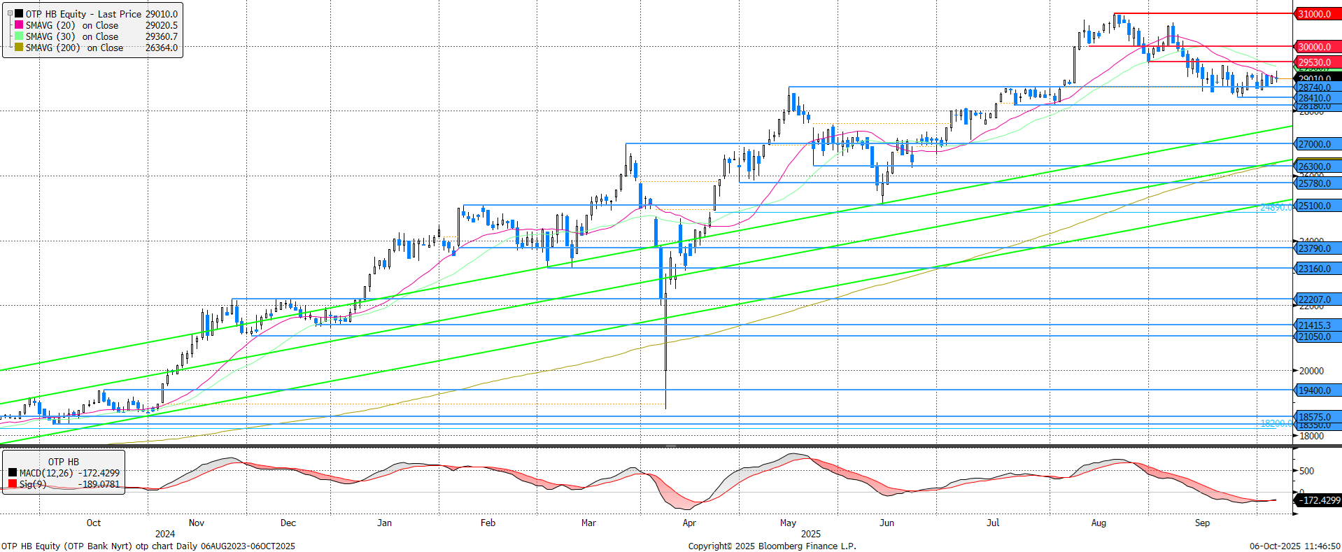 Az árfolyam stabilizálódott, miközben az MACD indikátor megadta a vételi jelzést, mely tényezők az árfolyam emelkedésének irányába mutatnak. Ellenállást a rövidtávú, 20 és 30 napos mozgóátlagok jelentenek 29.020 és 29.361 forintnál. Közben az akvizíciós találgatások is felélénkültek, miután a kazah nagykövet nyilatkozott az OTP esetleges kazahsztáni terjeszkedéséről.