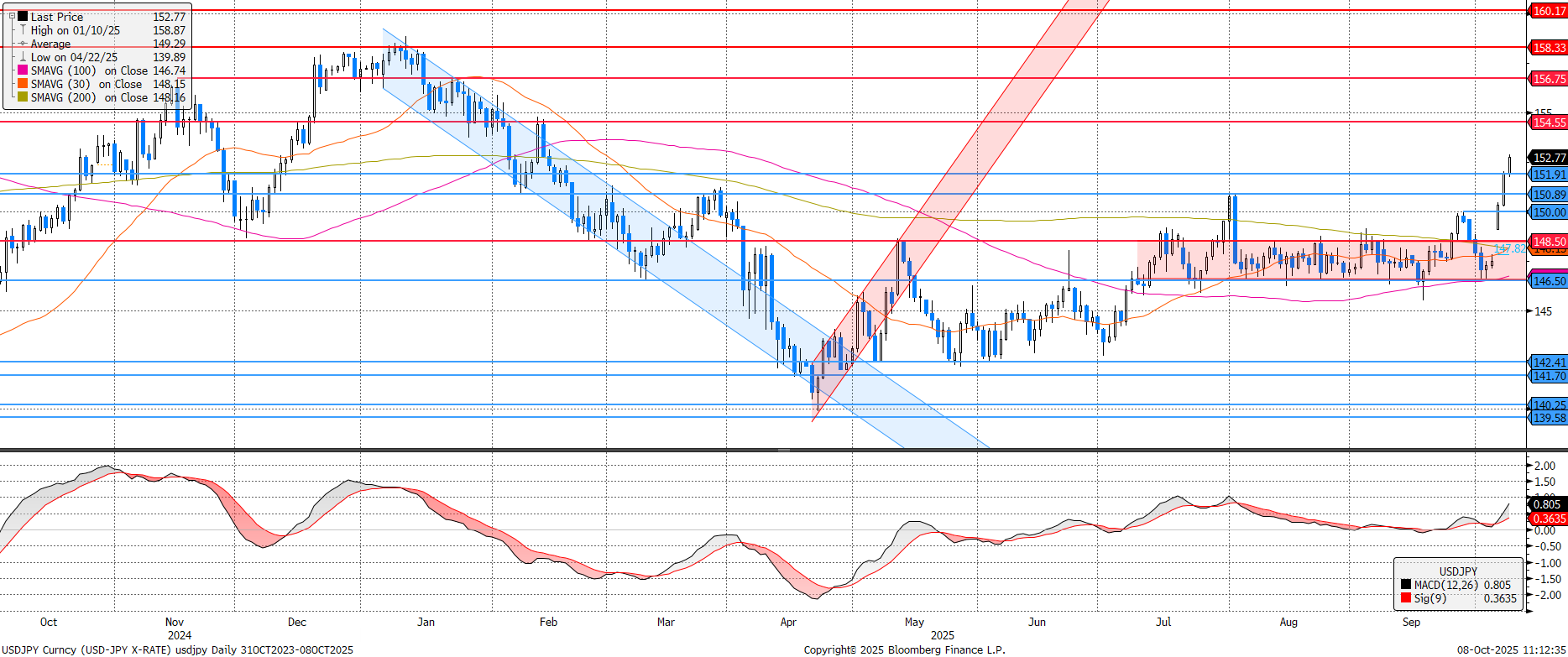Véget ért az USDJPY oldalazása, legutóbb februárban volt ilyen gyenge a dollárral szemben a jen. Japánban a múlt hétvégén tartott kormányzópárti LDP vezető választás meglepetésgyőztese gyors átrendeződést hozott. Ennek az oka, hogy várhatóan az ország az expanzívabb fiskális politika útjára lép. Ezért az október végi kamatemelési várakozás esélye 25%-ra csökkent, amivel gyakorlatilag lefeleződött, jegybanki oldalról nézve rontva az árfolyam megtámasztásának valószínűségét.