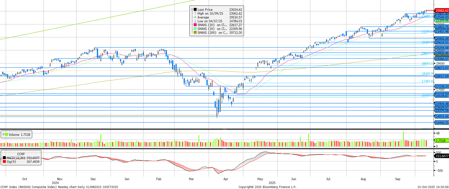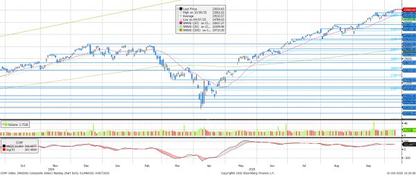 Napról napra új történelmi csúcsra emelkedett a Nasdaq index. Az emelkedés annak ellenére is tovább folytatódhat a következő napokban, hogy az RSI index értéke 69-re emelkedett, ami már a túlvettség határán helyezkedik el. Az indexet az sem zavarta az emelkedésben, hogy a BoE a tech részvények, különösen az AI részvények magas értékeltségének kockázatára hívta fel a figyelmet a héten megjelent negyedéves pénzügyi stabilitási jelentésében.