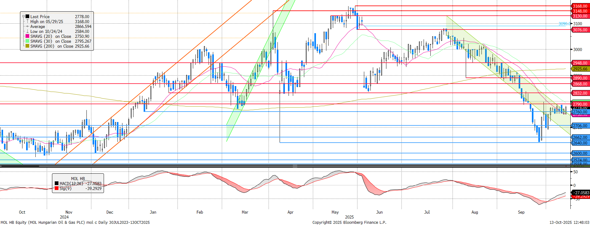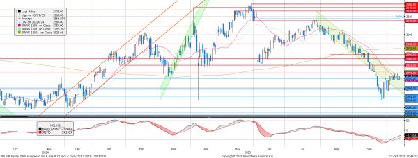 Az elmúlt napokban a 20 napos mozgóátlaghoz tapadt a MOL árfolyama. Ebből az sem tudta kimozdítani, hogy a szerb NIS ellen élesedtek az amerikai szankciók, ami elvileg kedvezőbb finomítói környezetet eredményez az iparág többi szereplője számára. Ellenállás 2.790 forintnál, míg támaszszintek 2.760 és 2.751 forintnál látszódnak, vagyis meglehetősen szűk tartományban mozoghat csak szabadon az árfolyam.