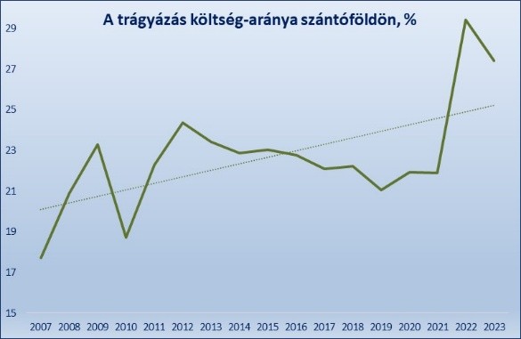 - Itthon akár legyinthetnénk is - hisz a statisztikai adatok szerint, 2025 első felében a növényei termékek árai 26,8 %-kal voltak magasabban, mint egy évvel korábban, miközben a műtrágyaárak csak fele ilyen ütemben, 12,7%-kal emelkedtek - de a trágyaköltségek aránya a szántóföldi növénytermesztés költségszerkezetében trendszerűen emelkedik. Az AKI FADN adatai szerint napjainkban közelítik a 30 %-ot.