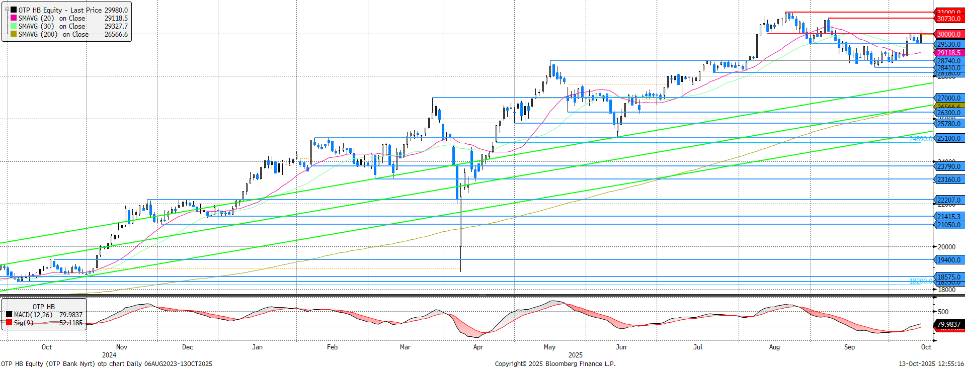 Jelentős felpattanás látható az OTP árfolyamában. Jelenleg éppen a 30.000 forintos szinttel küzd az OTP, melynek áttörése esetén tér nyílna az árfolyam további emelkedése előtt is. Viszont érdemes lesz figyelni, hogy az OTP 30.000 fölött is folytatja-e a sajátrészvény-visszavásárlásokat, vagy ismét szünetelteti azt, ahogy tette ezt augusztus második felében és szeptember elején.