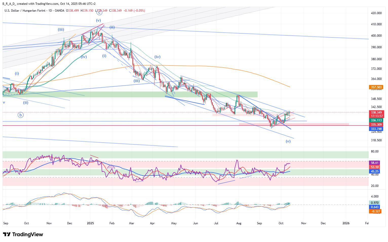 A következő időszakban egy lassú - minimális árfolyamváltozással járó emelkedés lehetőségét fenntartva - lefordulásra és esésre számítunk, amelynek az elsődleges célára 335,80.